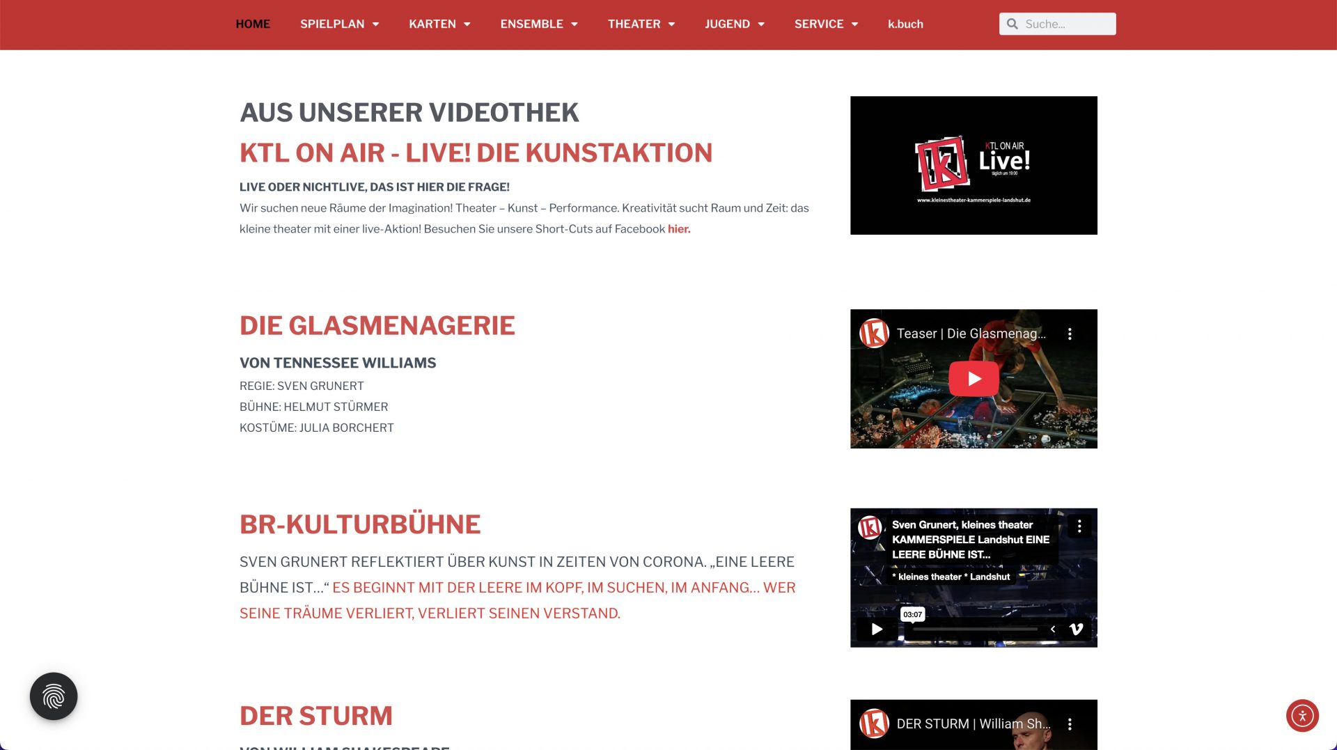 Für das Kleine Theater – Kammerspiele Landshut wurde ein stimmungsvolles und kulturorientiertes Webdesign gestaltet, das Atmosphäre schafft und gleichzeitig funktional überzeugt. Im Mittelpunkt stehen aktuelle Stücke, Spielpläne und Informationen zum Ensemble – ansprechend präsentiert in einer klar strukturierten Seitenarchitektur. Dunkle Akzente und starke Bilder transportieren die emotionale Tiefe des Theaters, während der responsive Aufbau und die intuitive Navigation für ein optimales Nutzungserlebnis auf allen Geräten sorgen. Kultur digital erlebbar – modern, benutzerfreundlich und mit Wiedererkennungswert.